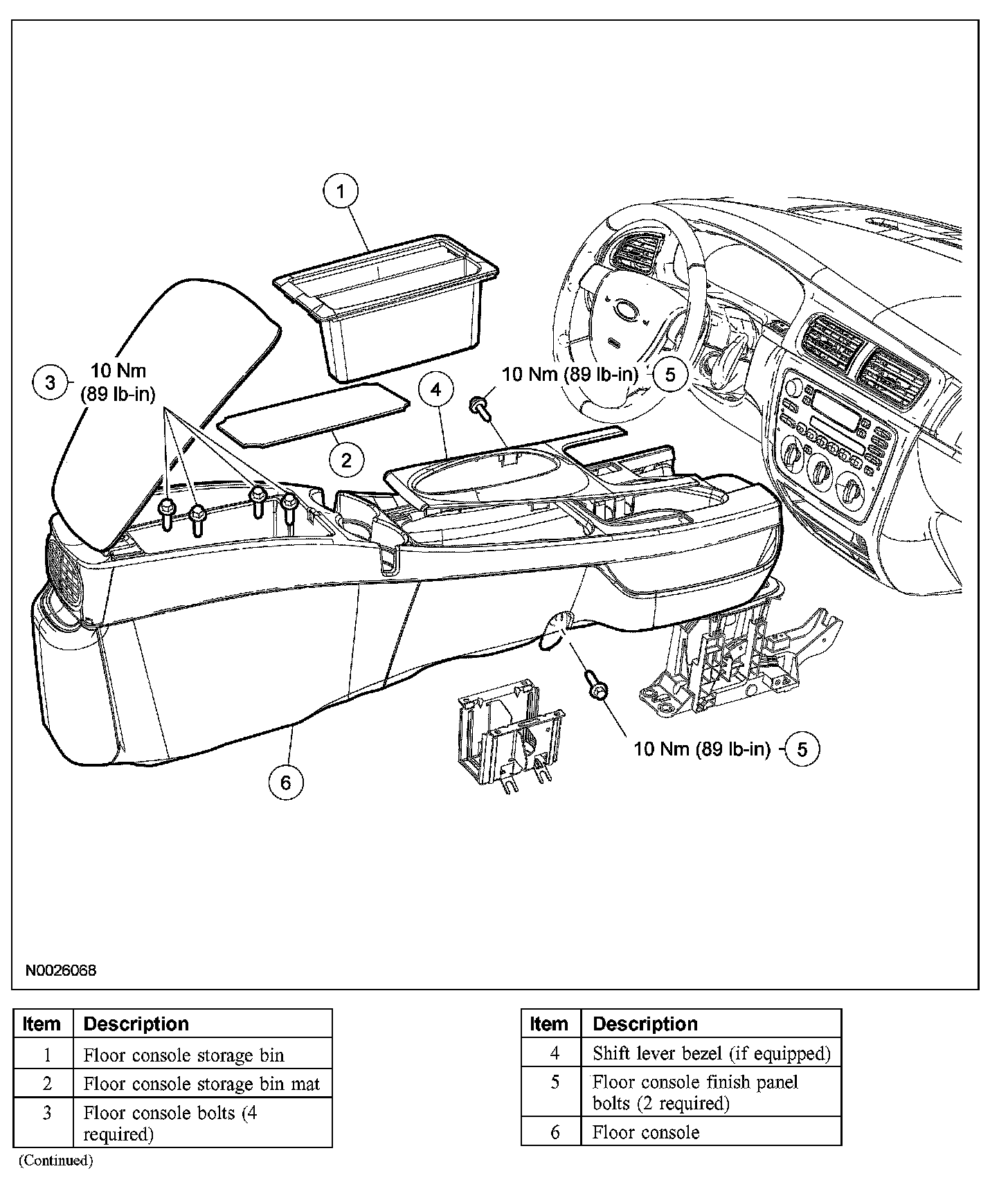 3. Remove floor console storage bin mat and the 4 floor console bolts.