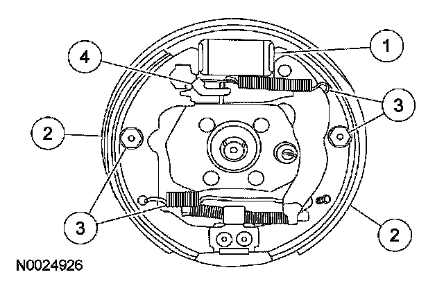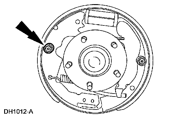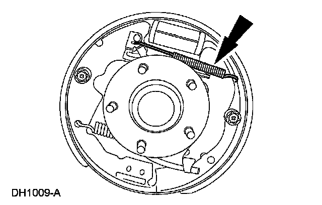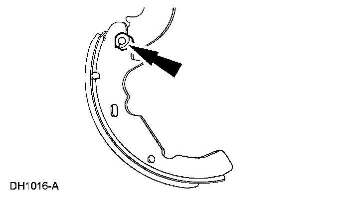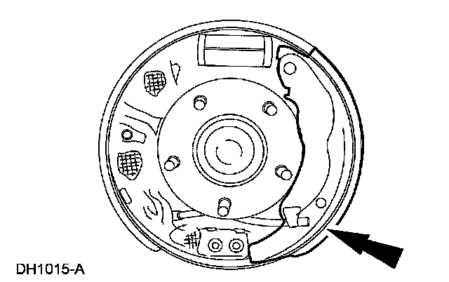 ^ Inspect the rear brake shoes and linings for minimum thickness, above the backing plate or rivets, and install new as necessary.