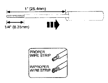 2. Strip 1/4" (6.35mm) of insulation from each wire end, taking care not to nick or cut wire strands.