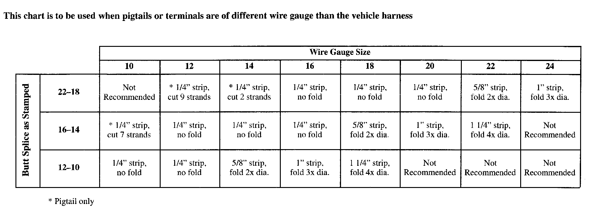 The given chart is to be used when pigtails or terminals are of different wire gauge than the vehicle harness.