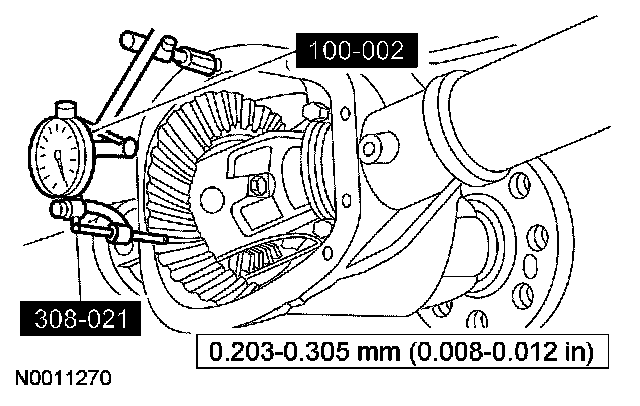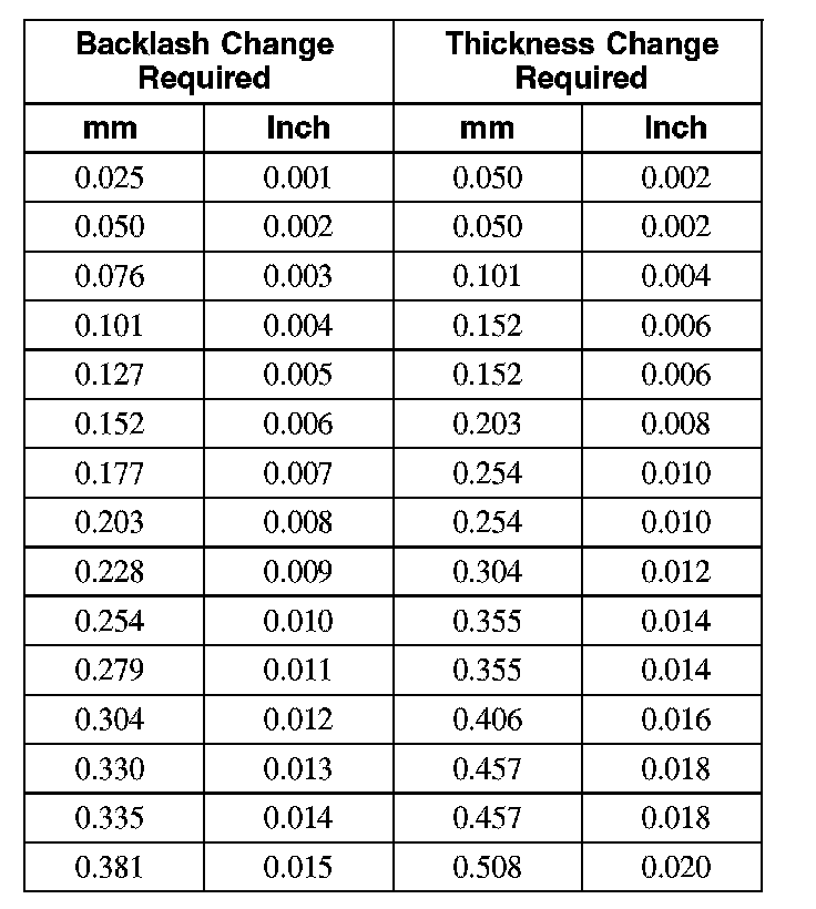 11. If a zero backlash condition occurs, add 0.51 mm (0.020 inch) to the RH side and subtract 0.51 mm (0.020 inch) from the LH side to allow backlash indication. Measure the backlash. Refer to Measuring backlash in this procedure.