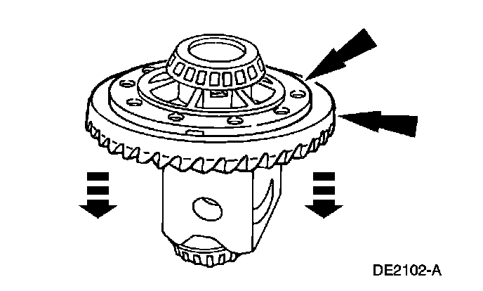 2. Position the differential ring gear and the differential case. Align the bolt holes by starting 2 bolts through the holes in the differential case and the differential ring gear. Press the differential ring gear on the differential case.