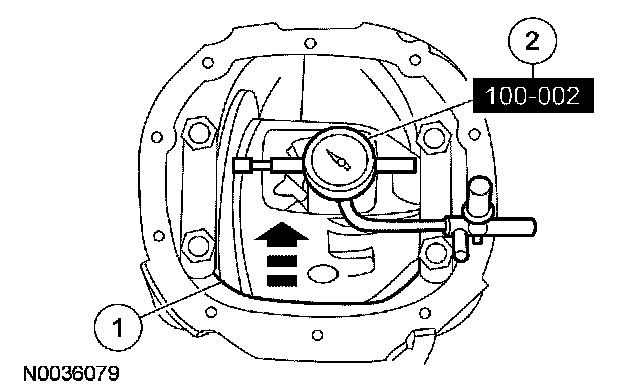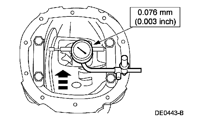 9. If the differential ring gear backlash variation between teeth measurement, taken at the beginning of this procedure, did not exceed the specification, proceed to Step 14. If the differential ring gear backlash variation between teeth measurement, taken at the beginning of this procedure, exceeded the specification, the cause may be a warped differential ring gear or differential case/differential bearing damage. Proceed as follows to verify the cause of the excessive backlash.