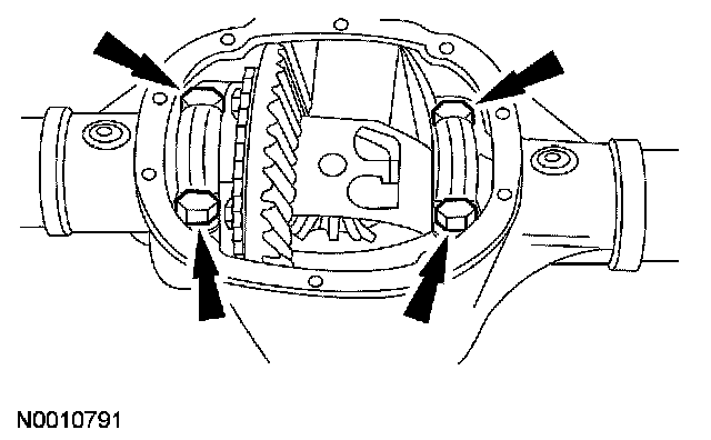 5. CAUTION: Mark the position of the differential bearing caps, as the arrows may not be visible. Always install the bearing caps in their identical locations and positions.