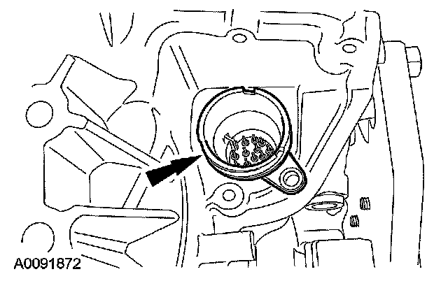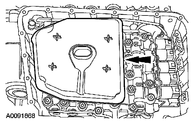 CAUTION: Make sure that the transmission fluid filter is fully seated into the bore. If the transmission fluid filter is not correctly installed, internal transaxle damage will occur.