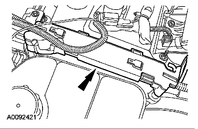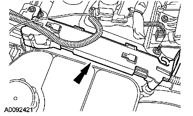 6. Attach the wiring harness retainers. Connect the fuel rail pressure and temperature sensor and the fuel injectors electrical connectors.