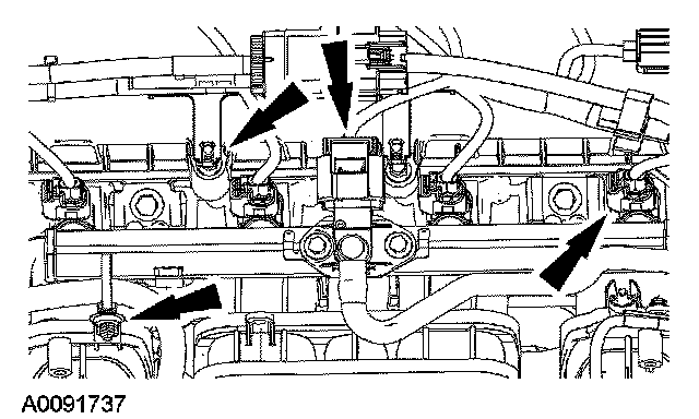 7. Disconnect the fuel rail pressure and temperature sensor and the fuel injector electrical connectors. Detach the wiring harness retainers.