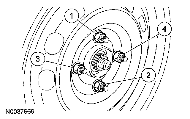 2. CAUTION: Failure to tighten the wheel nuts in the pattern shown can result in high wheel and tire runout, which will speed up the development of brake roughness, shudder and vibration.