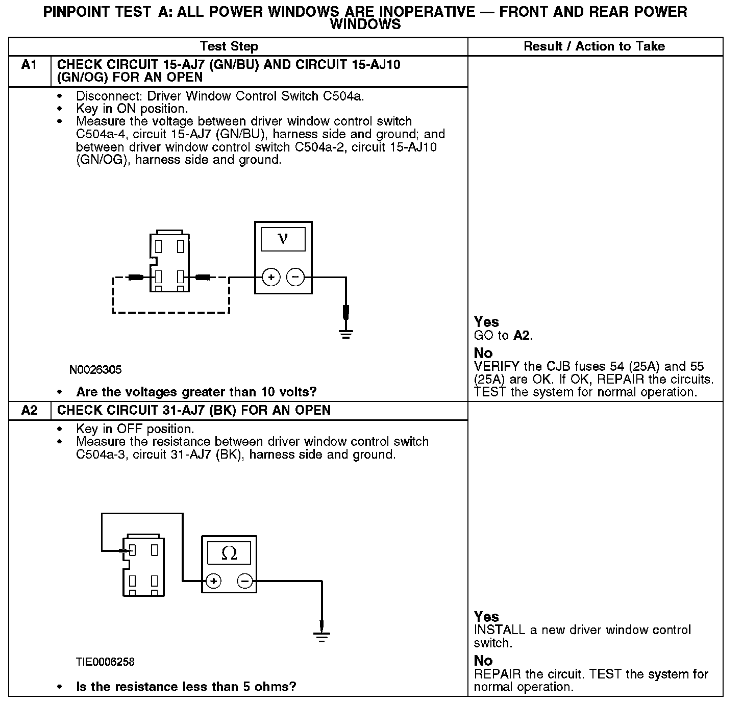 PINPOINT TEST A: ALL POWER WINDOWS ARE INOPERATIVE - FRONT AND REAR POWER WINDOWSA1-A2: