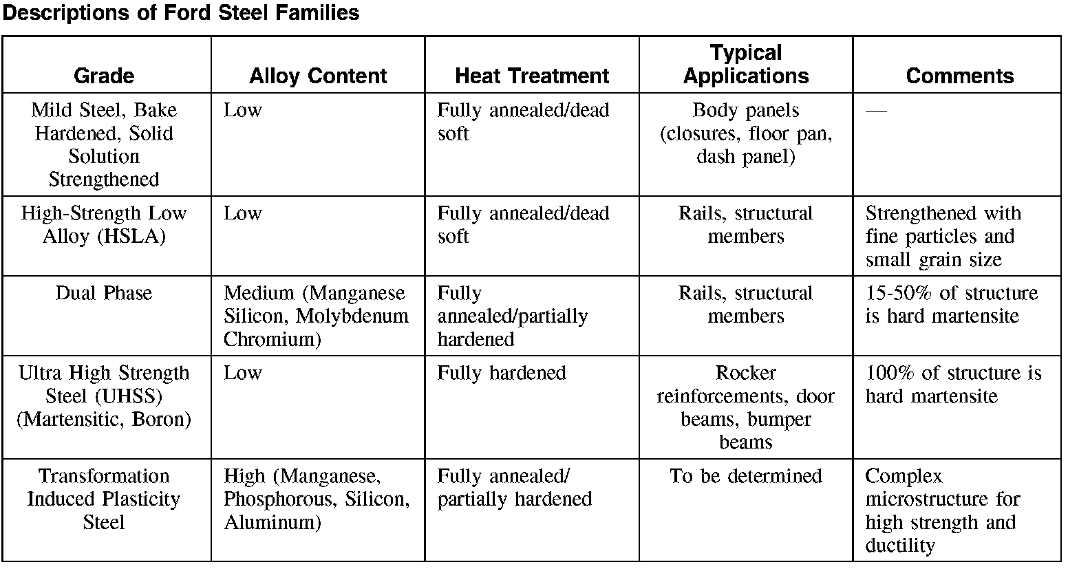 Descriptions Of Ford Steel Families: