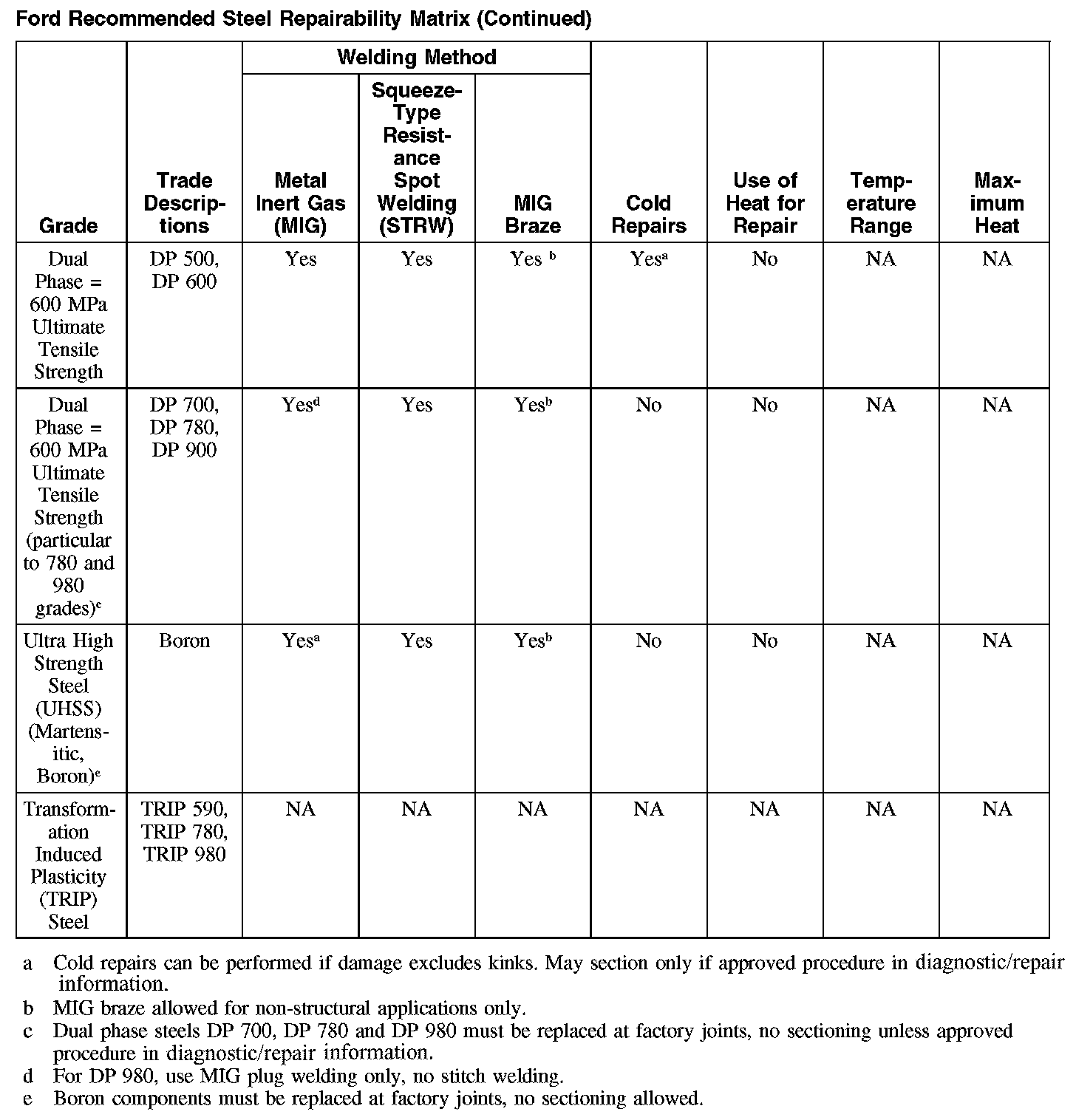 Ford Recommended Steel Repairability Matrix (Part 1):