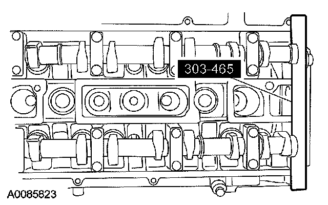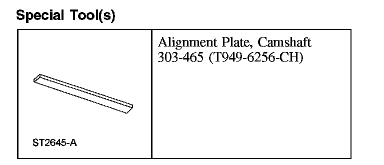 9. CAUTION: The special tool 303-465 is for camshaft alignment only. Using this tool to prevent engine rotation can result in engine damage.