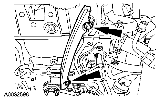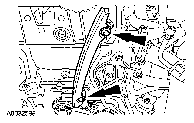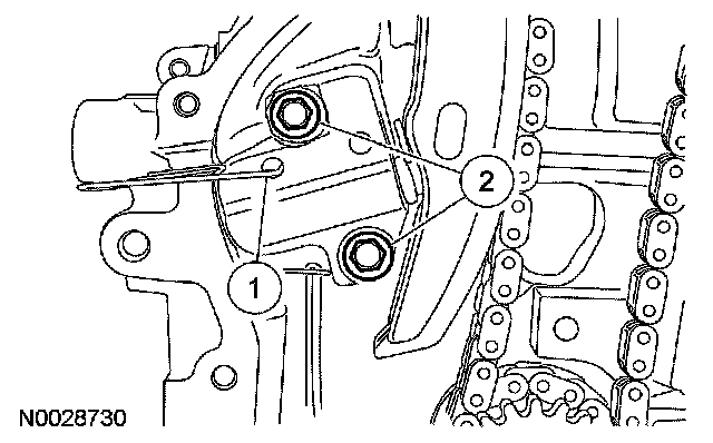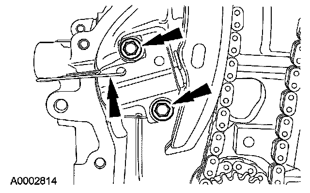 7. Install the timing chain tensioner and the bolts. Remove the paper clip to release the piston.