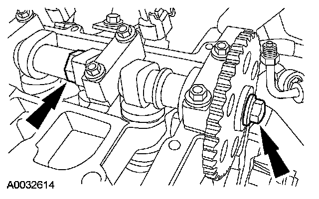 If the camshaft sprockets were not removed, use the flats on the camshafts to prevent camshaft rotation and loosen the sprocket bolts.