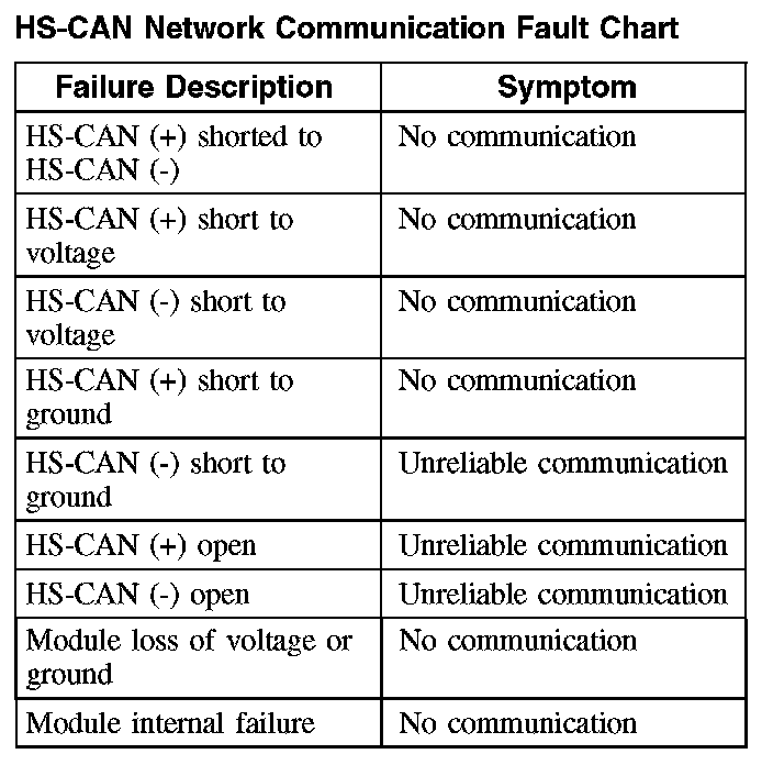 The fault chart describes the specific HS-CAN network failures and their resulting symptom:
