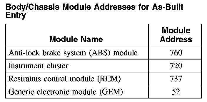 Body/Chassis Module Addresses for As-Built Entry: