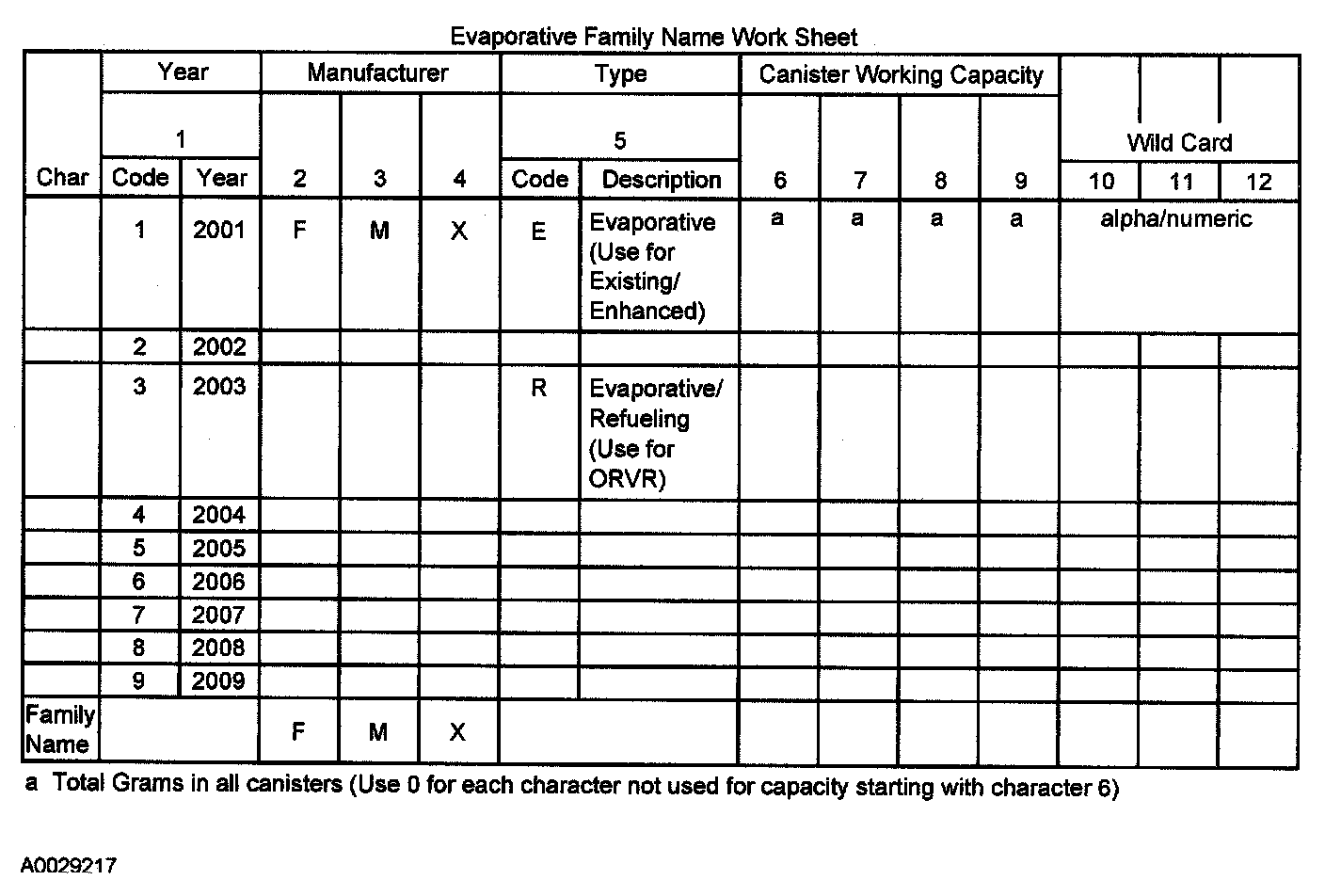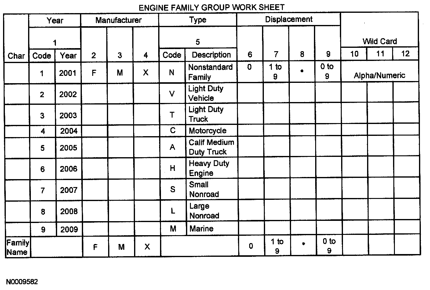 Both the engine family group and the evaporative family name are listed in the box on the emission decal as indicated in the area marked as engine evaporative family information. The first line contains engine size and the 12-character engine family group. The second line contains the 12-character evaporative family name information. Both the engine family group and the evaporative family name are specific to the vehicle. Please refer to the Engine Family Group and the Evaporative Family Name worksheet for decoding information.