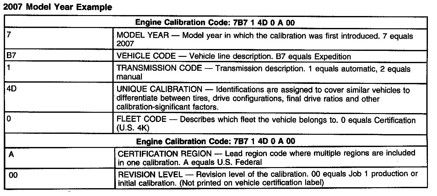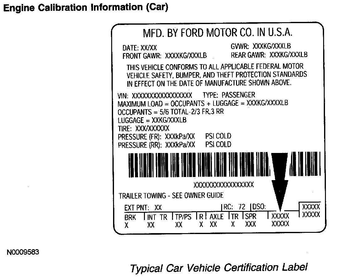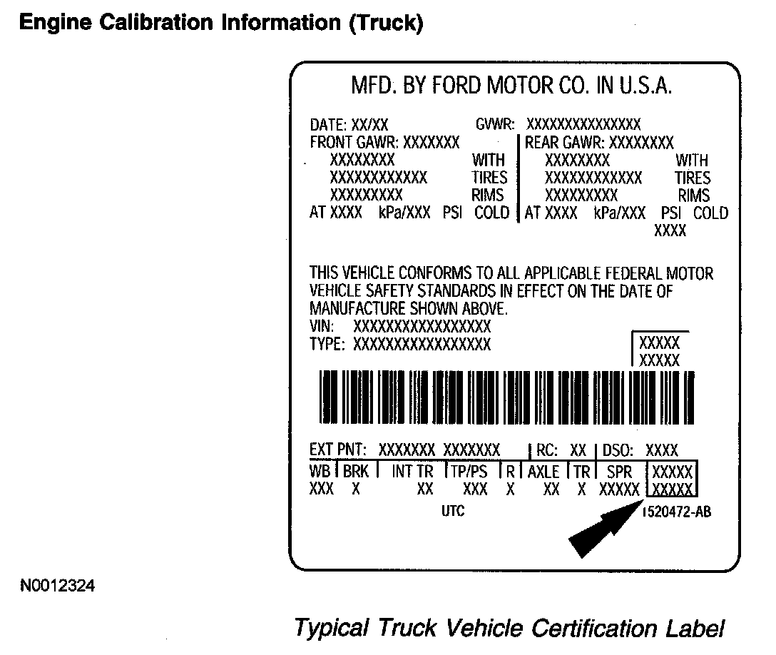 Base engine calibration information, also sometimes referred to as the powertrain calibration, is located in the lower right corner of the vehicle certification label. Engine calibration information is limited to a maximum of 5 characters per line (2 lines maximum). Calibration information more than 5 characters long wrap to the second line of this field. Only the base calibration appears on this label. The revision level is no longer printed on the label, however, it can be found in the On-Line Automotive Service Information System (OASIS). For more information on the vehicle certification label or engine calibration, refer to Vehicle/Application and ID, Identification Codes.