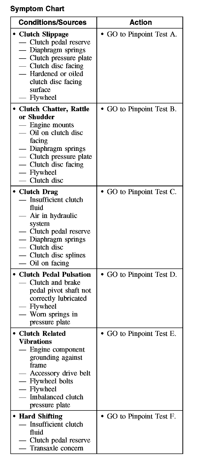 2. Compare the road test results with the following symptom chart. It is a list of conditions that are typical faults into which the transaxle will fall: