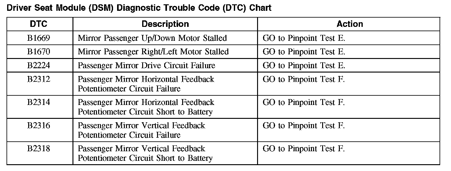 Driver Seat Module (DSM) Diagnostic Trouble Code (DTC) Chart