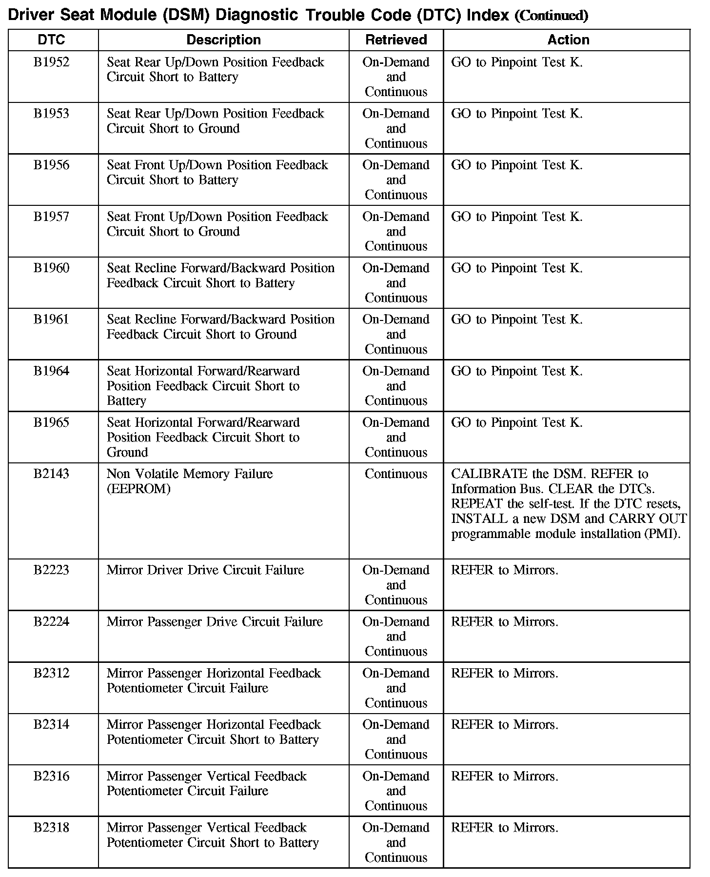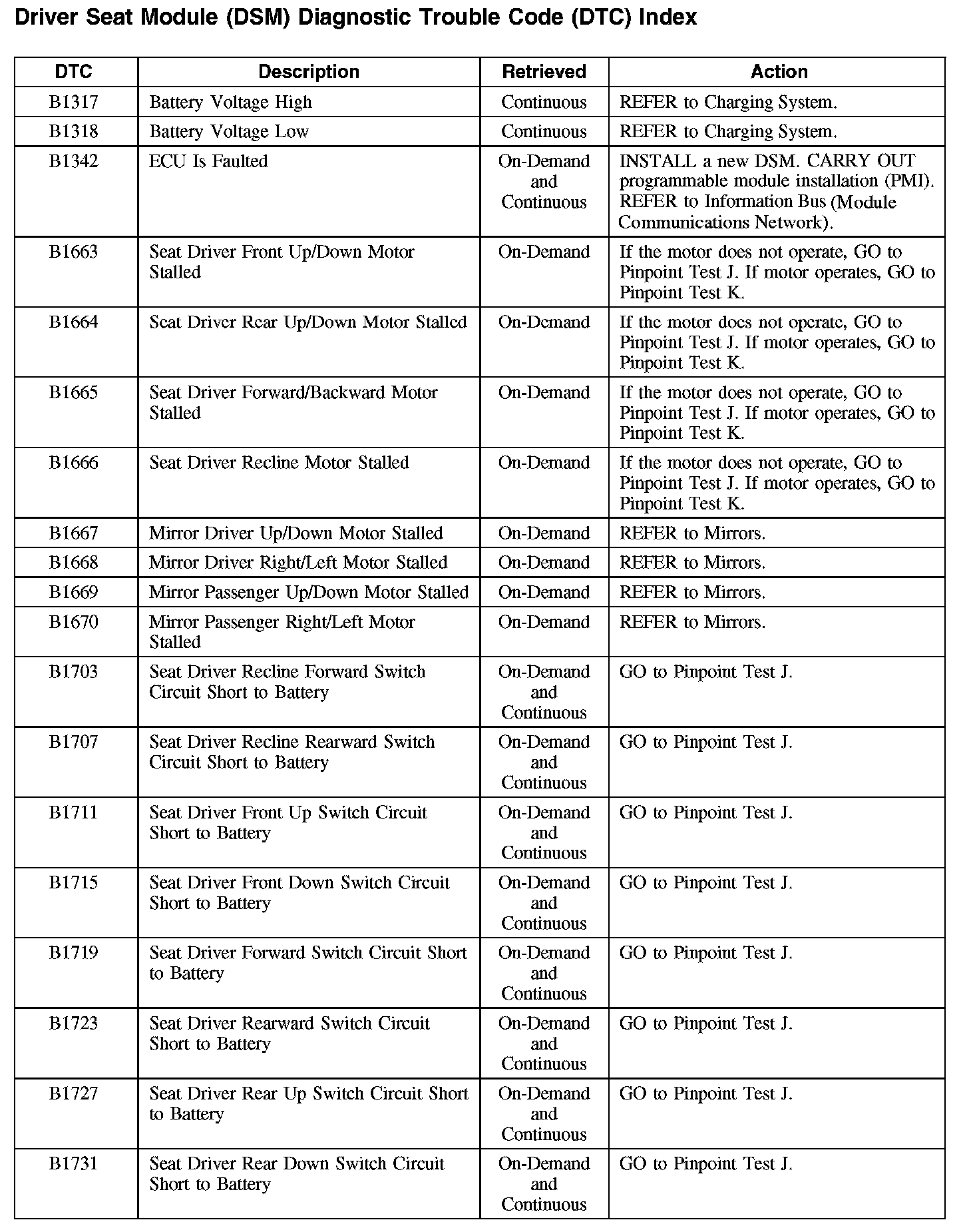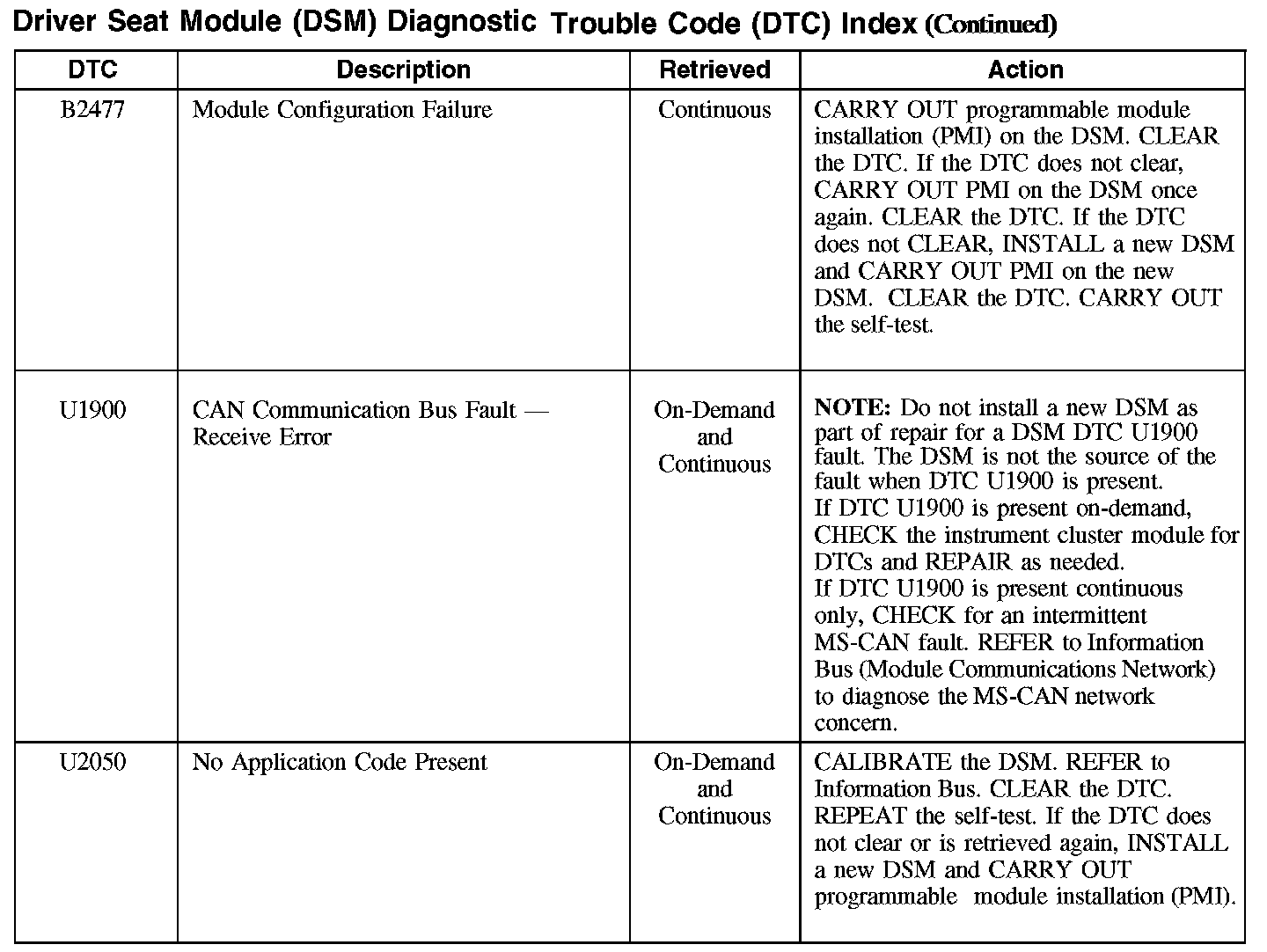 Driver Seat Module (DSM) Diagnostic Trouble Code (DTC) Index