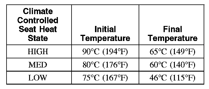 NOTE: The presence of overtemperature faults (DTCs B2729, B2730, B272A and B272B) can be induced by incorrect operation of the climate controlled seat system after an initial HEAT setting has been attained. If a HEAT setting is repeatedly turned OFF and ON in an attempt to increase the seat temperature, an overtemperature condition can result and the DTC(s) will be set.