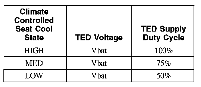 Each driver and front passenger seat cushion is equipped with a thermo-electric device (TED) assembly that includes a seat blower (fan motor, serviced as an assembly with the TED). Similarly, each driver and front passenger seat backrest is also equipped with its own TED assembly with blower. Cabin air is drawn through the blower and distributed to each of the TED modules located in the seat cushion and backrest. The TEDs then heat or cool the air. The air is then directed into the foam pad and manifold where it is distributed along the surface of the cushion and backrest of the seat. Once the system is activated, the DCSM uses a set of flexible algorithms to control the heating/cooling modes and the blower speed dependant on the EATC seat switch settings.