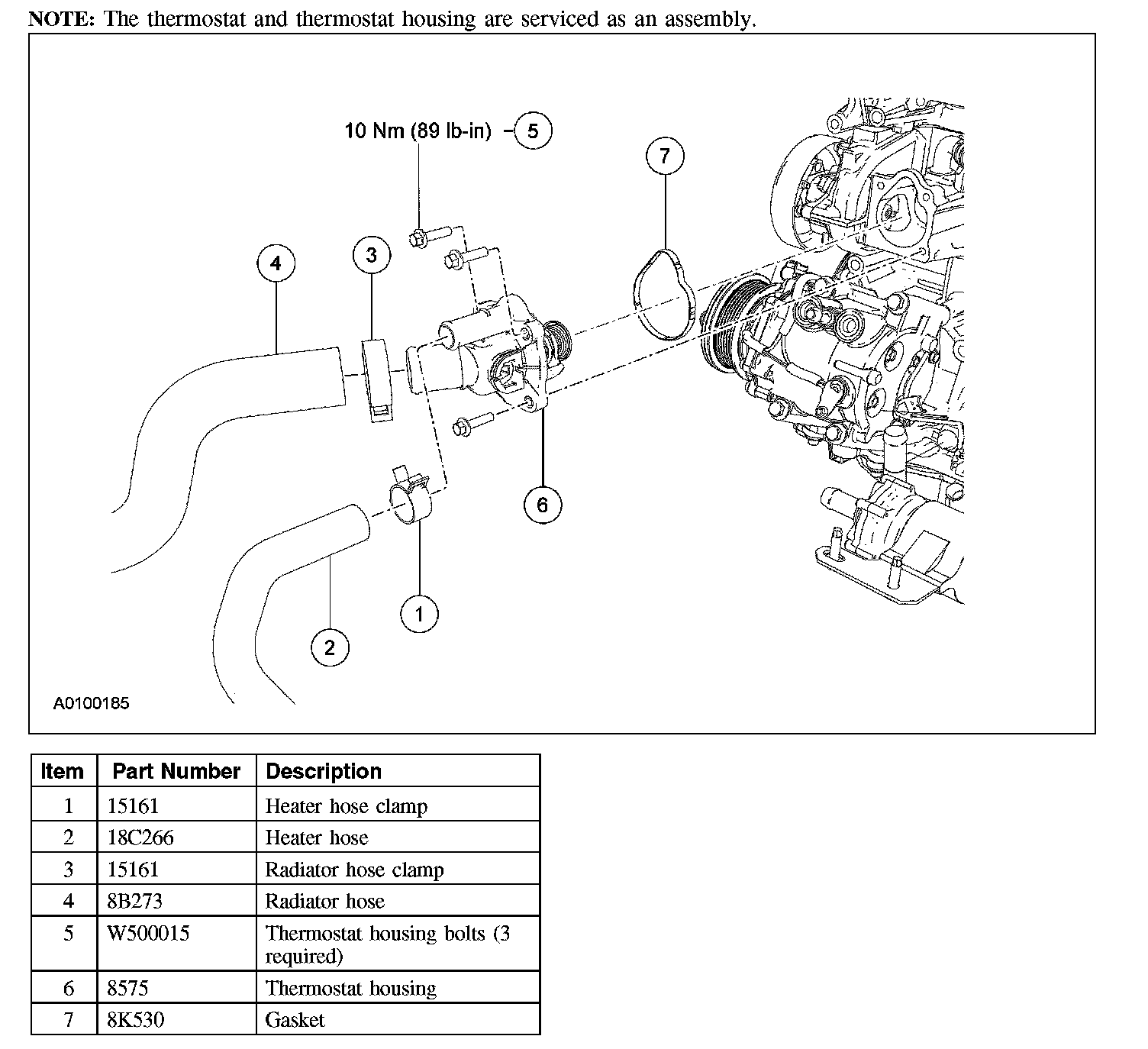 NOTE:The LH upper thermostat housing bolt can be accessed from under the hood. The RH upper and lower theromastat housing bolts can be accessed from under the vehicle as viewed in the illustration above.