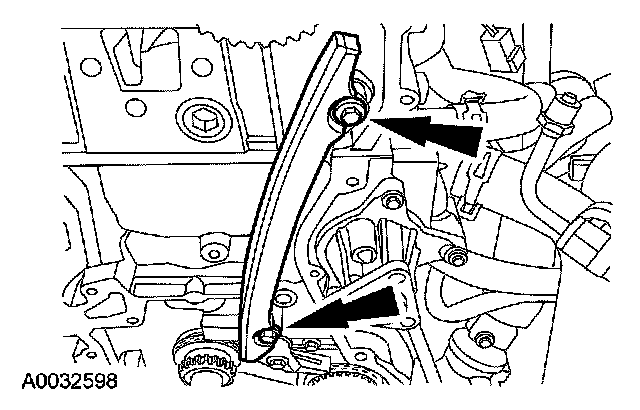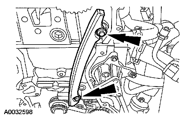 6. Remove the 2 bolts and the timing chain guide.