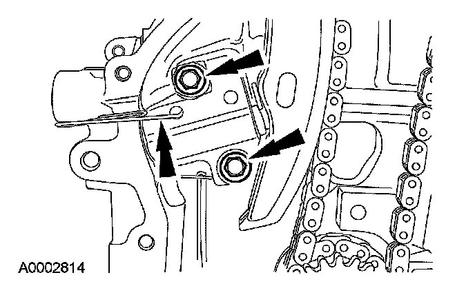 2 Remove the 2 bolts and timing chain tensioner.