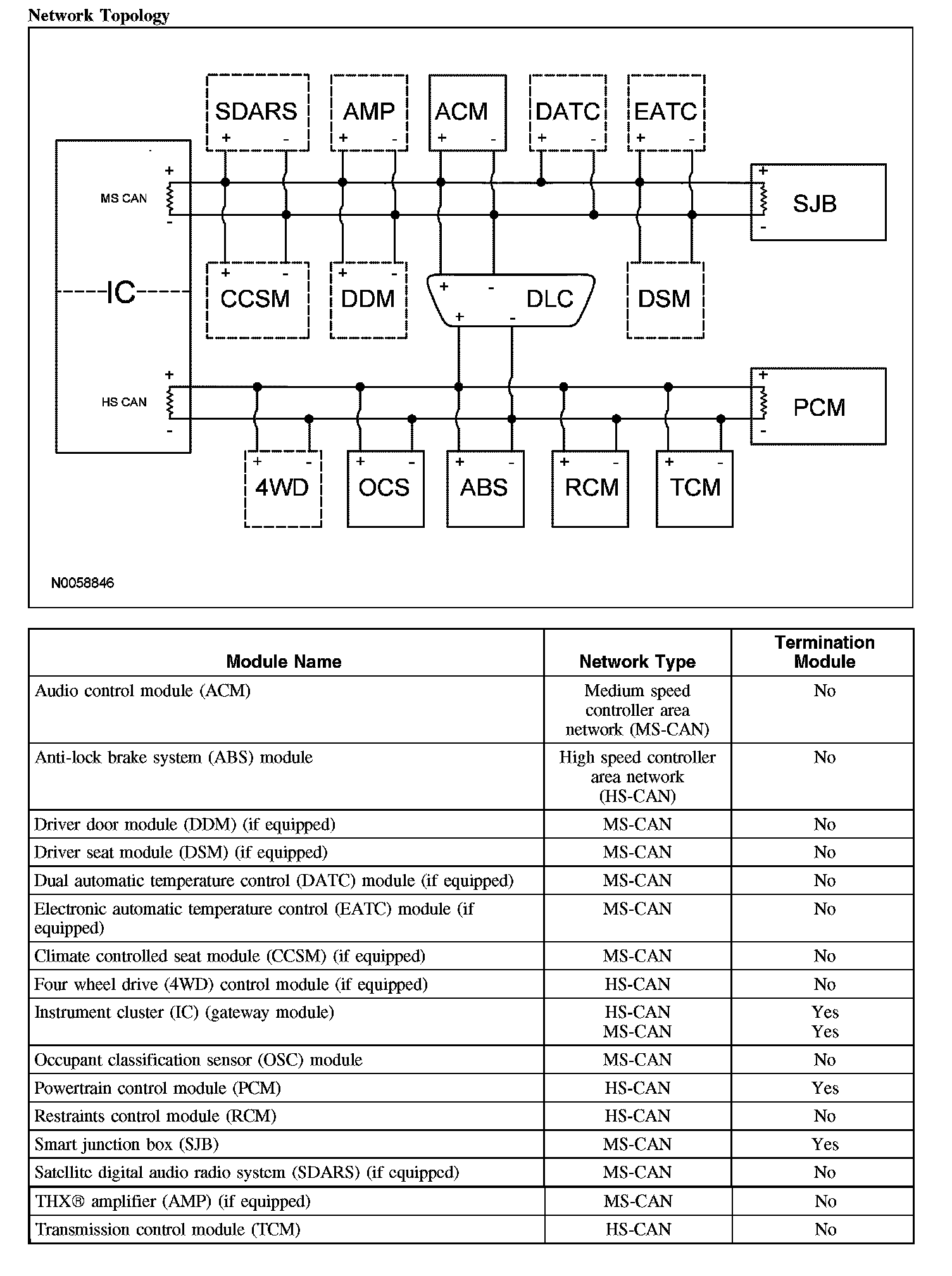 The instrument cluster is the gateway module, translating HS-CAN to MS-CAN and vice versa. This information allows a message to be distributed throughout both networks. The instrument cluster is the only module on this vehicle that has this ability.
