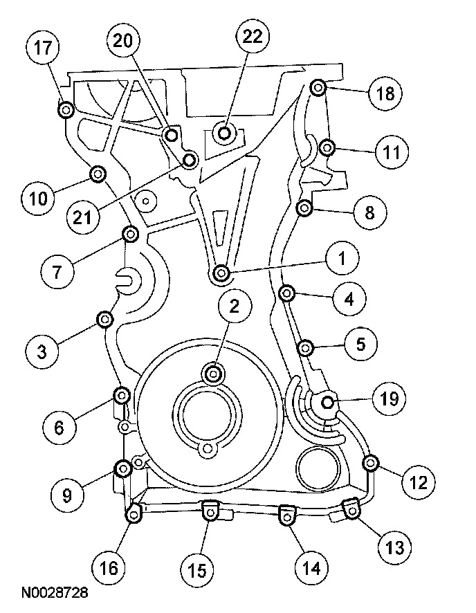 Install the engine front cover. Tighten the bolts in the sequence shown, to the following specifications: