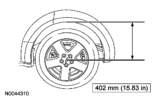 18. CAUTION: Before tightening the stabilizer bar bracket nuts, the suspension must be at the bushing fastener tightening position. Use a suitable jack to raise the suspension until the distance between the center of the hub and the lip of the fender is equal to 402 mm (15.83 inch).