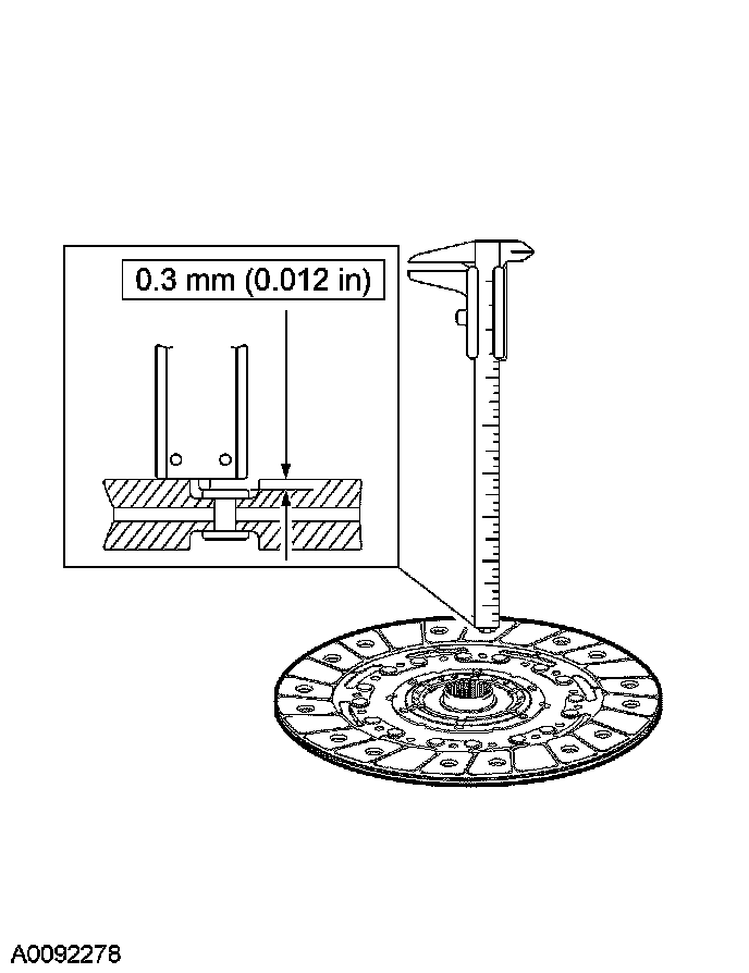 2. Check for a worn clutch disc lining. Measure the minimum allowable depth to the rivet heads with a slide caliper.