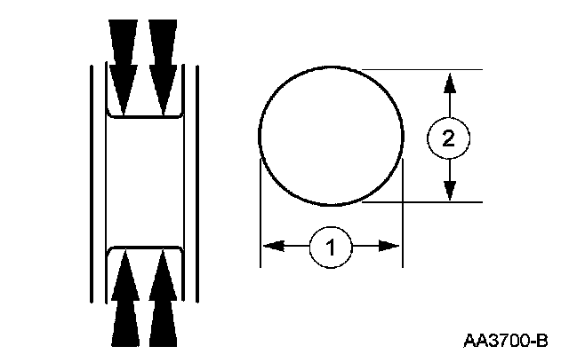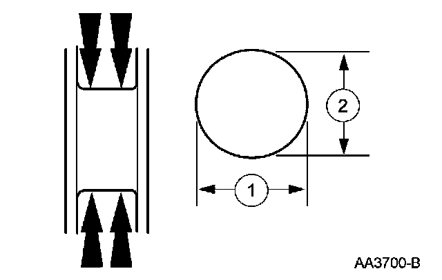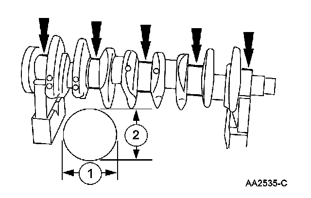 1. Measure the crankshaft connecting rod journal diameters in 2 directions perpendicular to one another at each end of the connecting rod journal. The difference in the measurements from one end to the other is the taper. Verify measurement is within the wear limit.