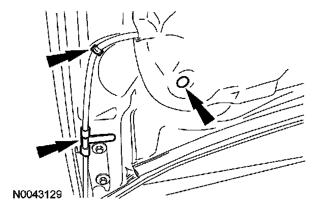 5. Release the 2 windshield washer hose retainers and the one hood insulation pin-type retainer.