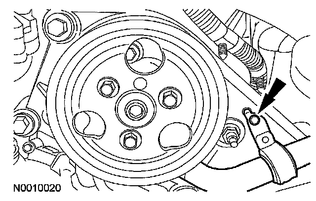 17. Remove the nut and power steering pressure tube bracket from the A/C compressor.