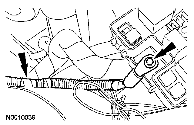 44. Remove the bolt and detach the ground cable from the RH strut tower.