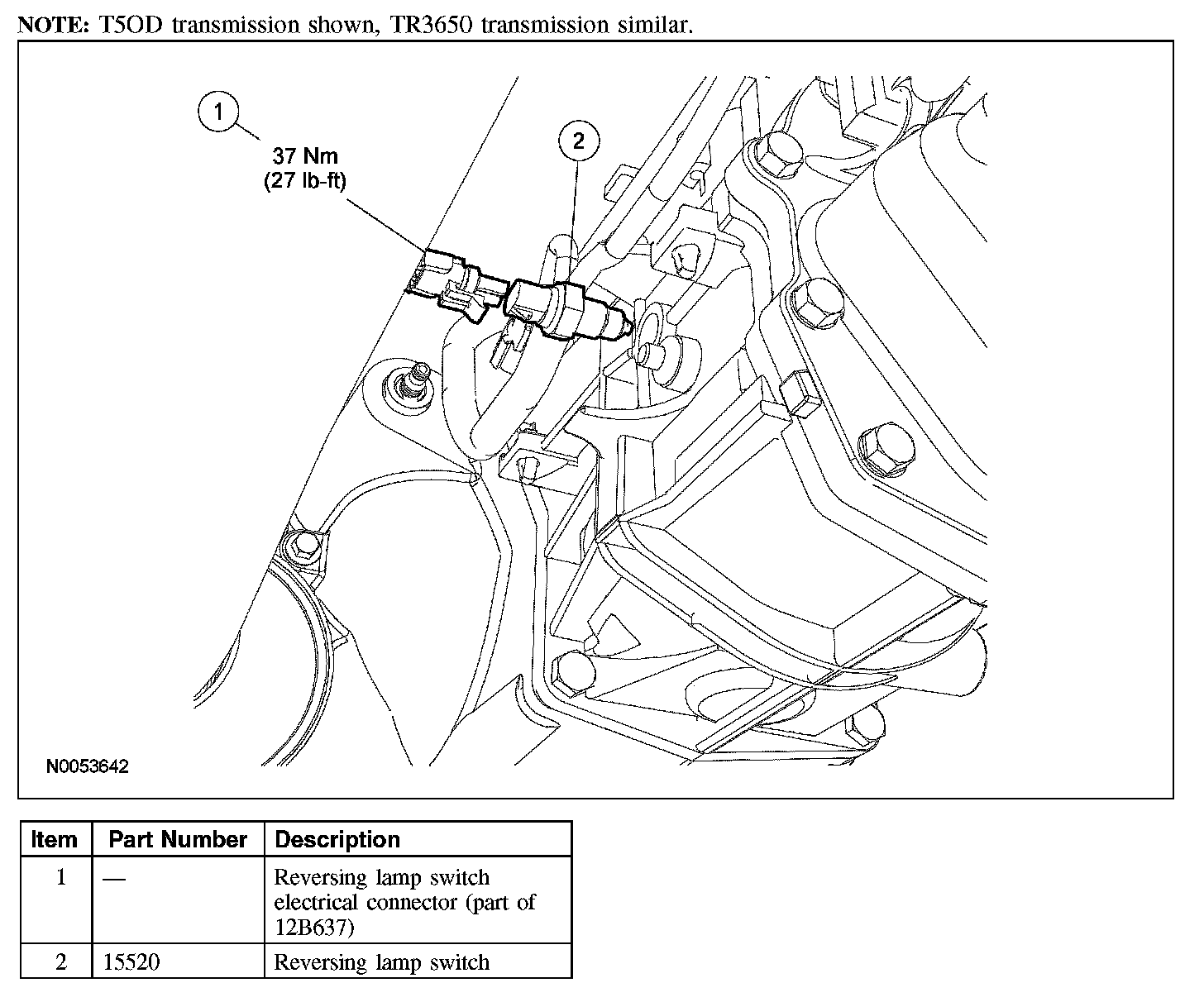 - To install, tighten to 37 Nm (27 lb-ft) (T5OD transmission).