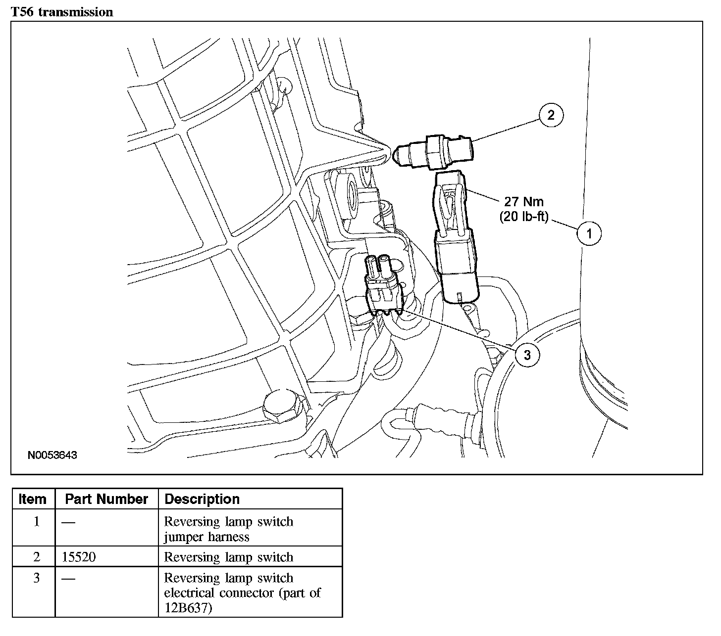 - To install, tighten to 27 Nm (20 lb-ft) (TR3650 or T56 transmission).