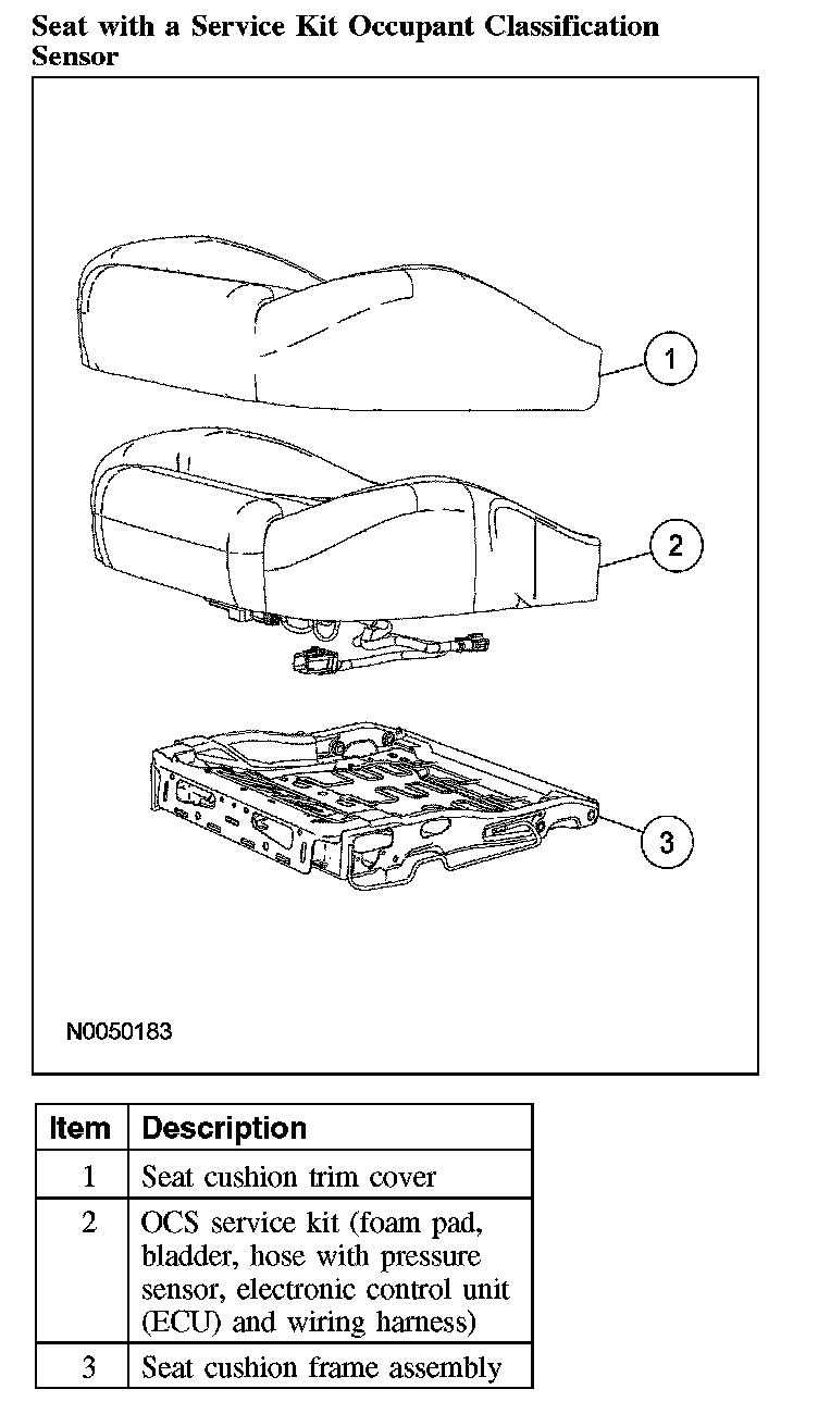 - OCS system components (seat cushion foam pad, bladder with pressure sensor and electronic control unit) are calibrated to each other and are serviced as an assembly. The OCS system components are not to be installed separately. If a new OCS system, OCS system component or seat cushion foam pad are needed, a new OCS system service kit (seat cushion foam pad, bladder with pressure sensor, electronic control unit and seat wiring harness) must be installed as an assembly.