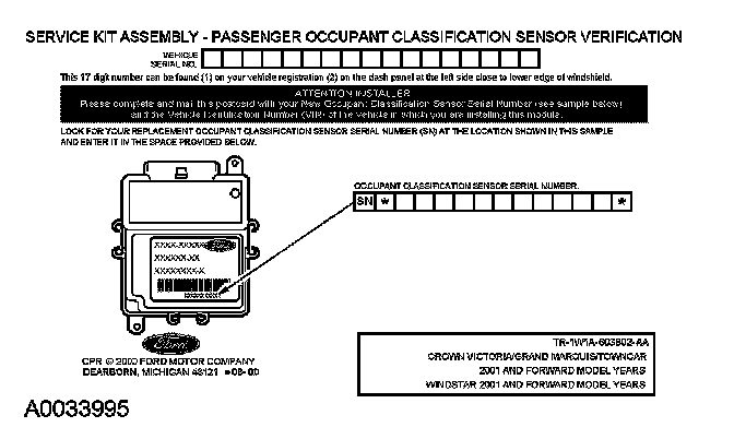 If a new OCS was installed, fill out the necessary information on the OCS traceability card and return it along with the complete inoperative occupant classification sensor to Ford Motor Company.