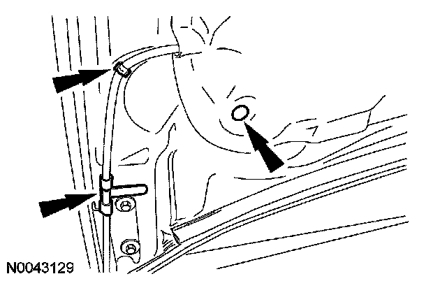 4. Release the 2 windshield washer hose retainers and the one hood insulation pin-type retainer.