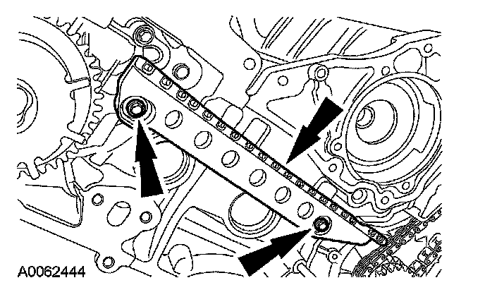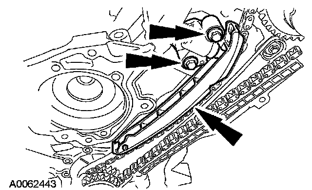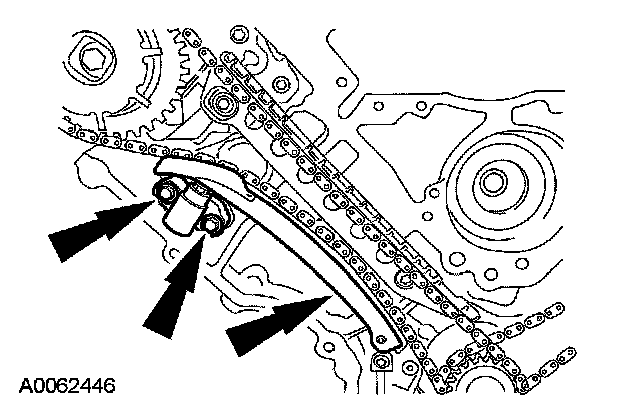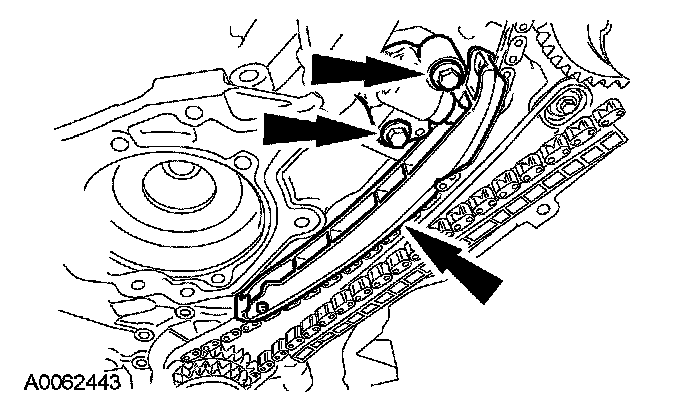 10. Remove the bolts, the LH timing chain tensioner and tensioner arm.