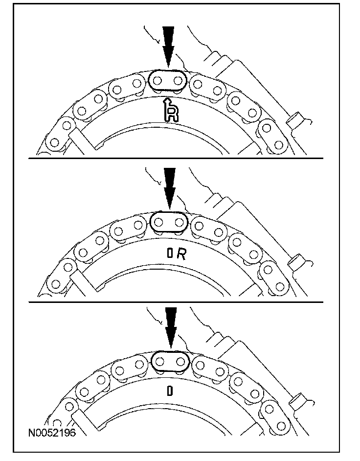 Position the RH timing chain on the camshaft sprocket. Make sure the camshaft sprocket timing mark is aligned with the copper (marked) chain link.