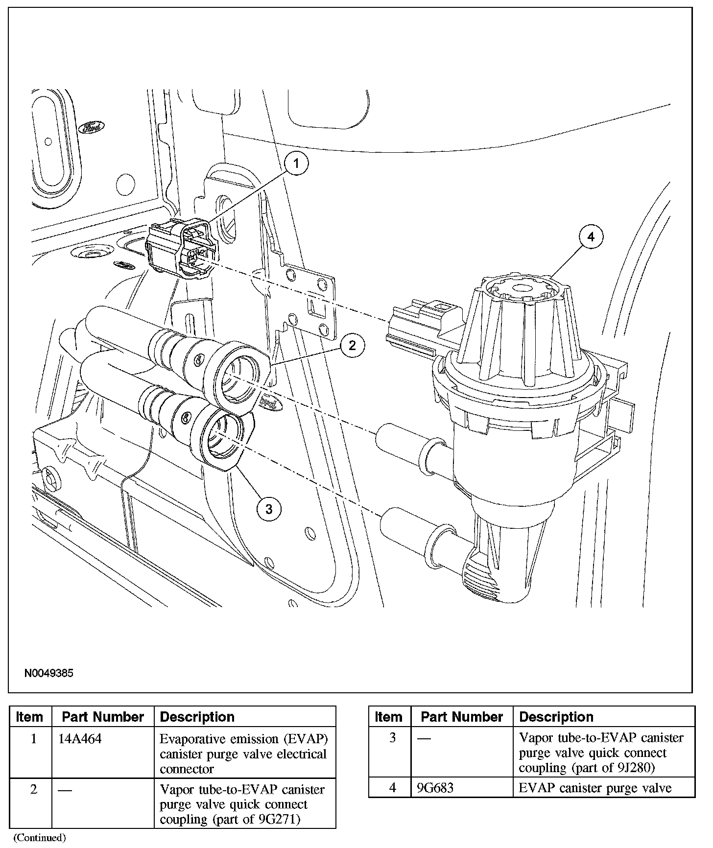 3. NOTE: The upper vapor tube has an identification tag attached on the end of tube near the quick connect coupling. If this vapor tube is removed or replaced make sure that the end with the identification tag is reconnected to the upper EVAP canister purge valve port.