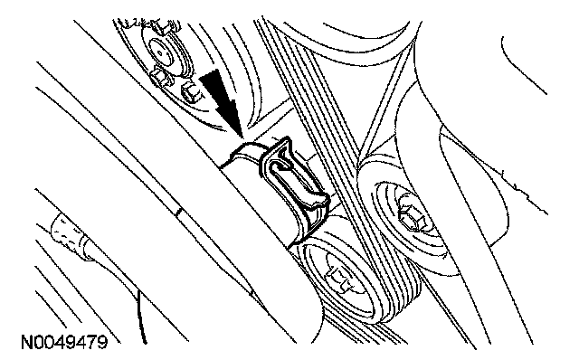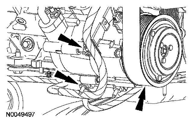 44. Position the SC drive belt away from the A/C compressor and detach the 2 wiring harness retainers from the A/C compressor stud bolts.