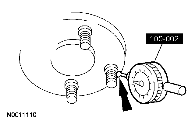 2. Rotate the hub or flange until the next bolt is contacted. Record the measurement and continue until each bolt is checked. The difference between the maximum and minimum contact readings will be the total wheel hub or axle flange bolt pattern runout. The runout must not exceed 0.38 mm (0.015 inch).