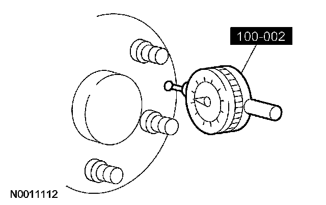 1. Position the special tool on the wheel hub or axle flange face, as close to the outer edge as possible. Zero the indicator to allow the pointer to deflect either way.