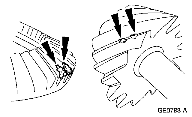 To check the ring gear and pinion, remove as much lubricant as possible from the gears with clean solvent. Wipe the gears dry or blow them dry with compressed air. Look for scored or damaged teeth. Also look for cracks or other damage.